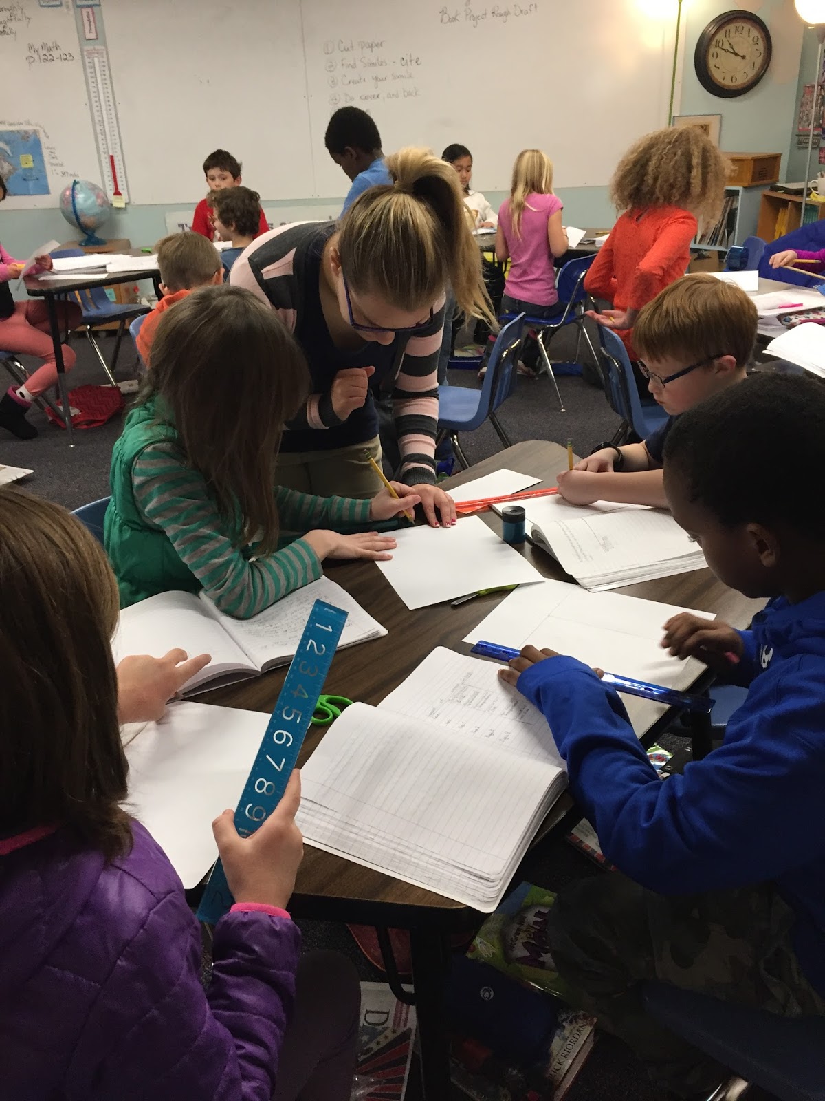 Rough drafts for the Small Book Project: first in the notebook and using the straight edge for creating the book size and making lines for their own writing. Creating their own simile for either Horace or Jemmy that will be in their book. In the background, Ms. Omni making rounds to help the kids figure out how the book is put together. This project totally stretched their brains. We will be using the rubric in the coming weeks to assess how they did. |